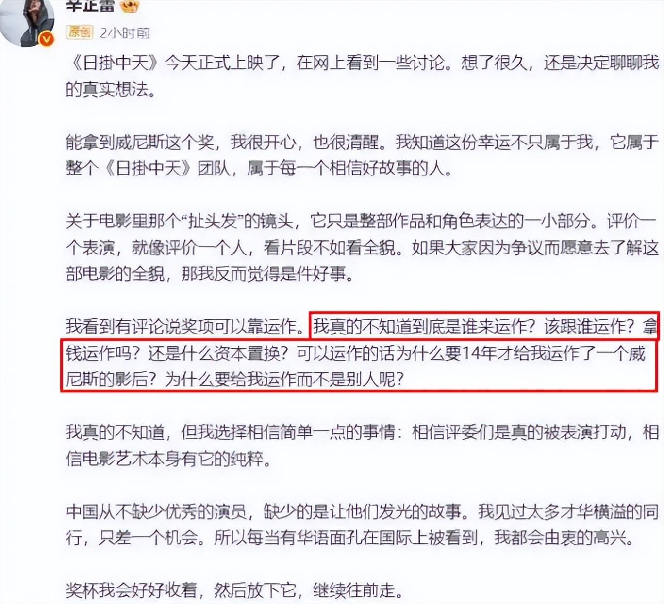 按理说,辛芷蕾斩获 “威尼斯影后”,本该是件值得庆祝的事。