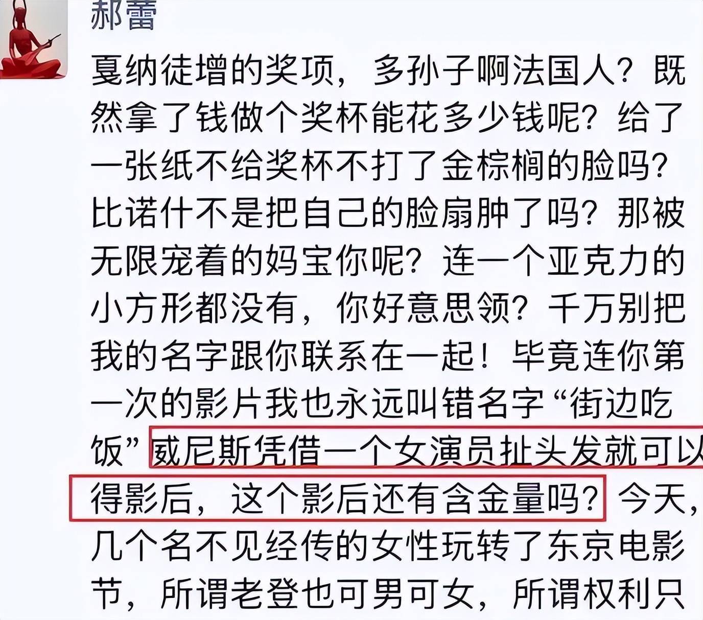 这位名称为“郝蕾”的用户直言“这个威尼斯影后还有含金量吗?”